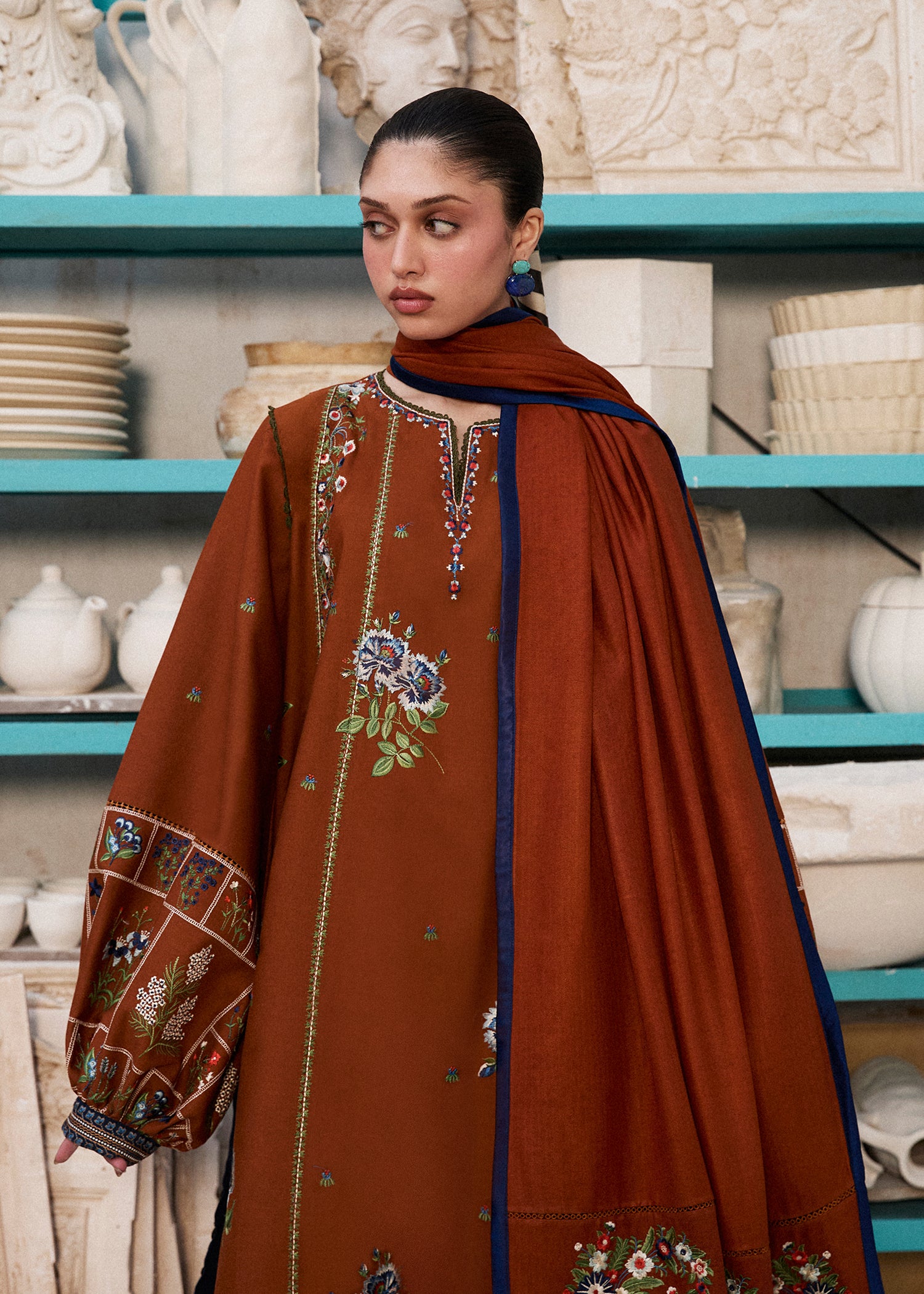This elegant three-piece outfit features a rust-colored khaddar A-line shirt, beautifully adorned with intricate embroidery, delicate lace details, and boring technique accents. The highlight of the shirt is its balloon sleeves, also intricately embroidered. It is paired with matching embroidered culottes and completed with a stunning embroidered shawl.
