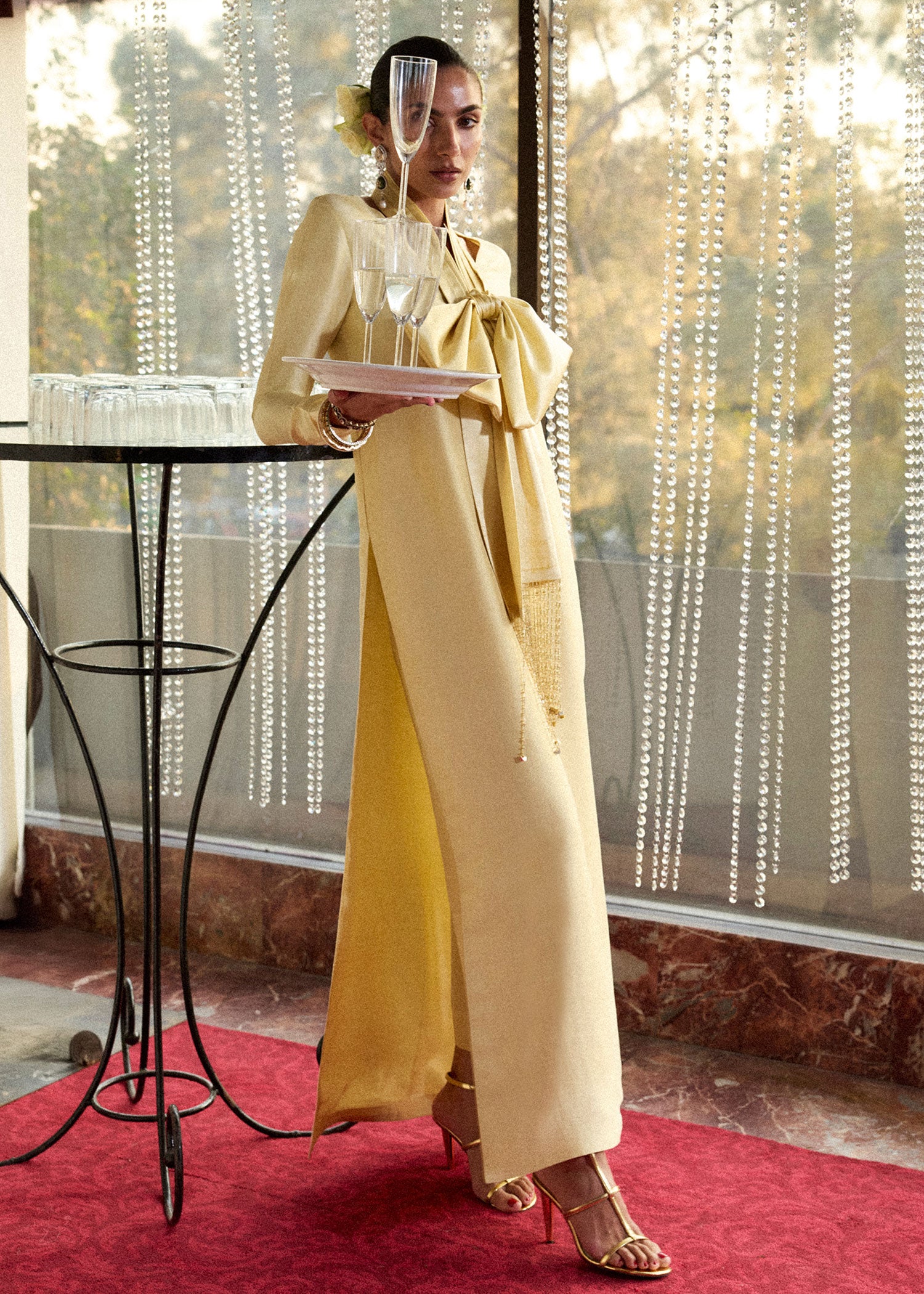 This ensemble is crafted from raw silk, featuring a long shirt with a prominent large bow at the bust level. This design incorporates refined tassel detailing, visible hanging from the front of the shirt. The soft silhouette and warm tones create a sophisticated look.