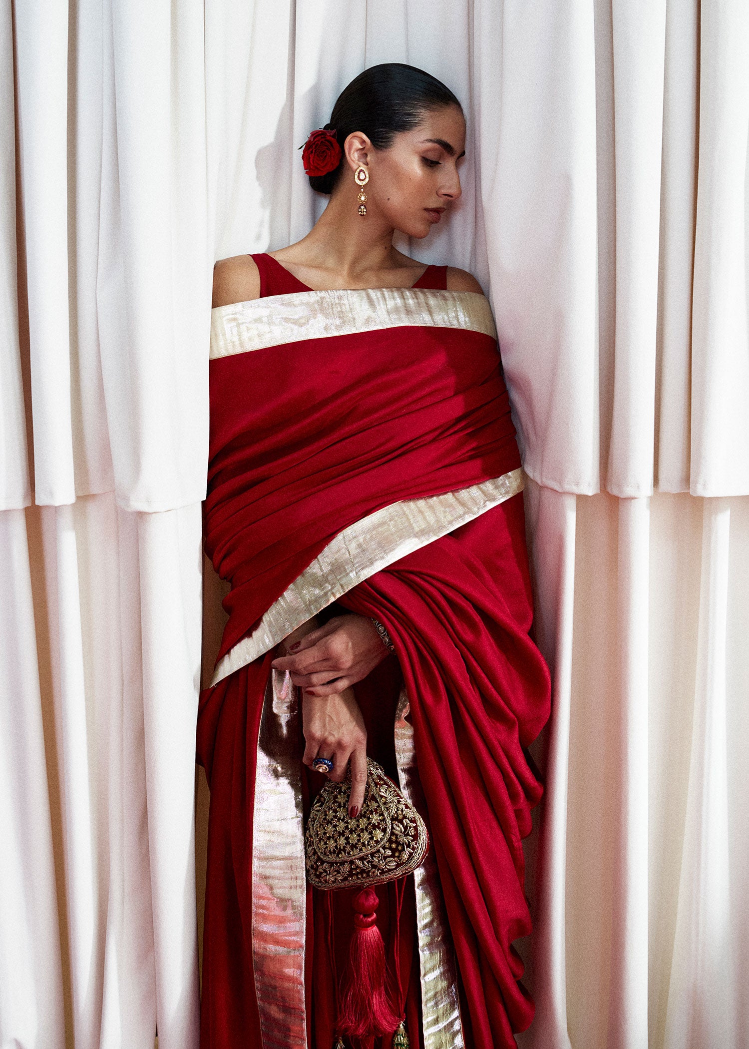 A sleeveless, scoop neck gown with fitted bodice. Its dupatta consists of a golden lappa on all four sides. It is made of a light, sheer chiffon fabric, giving it an ethereal quality.