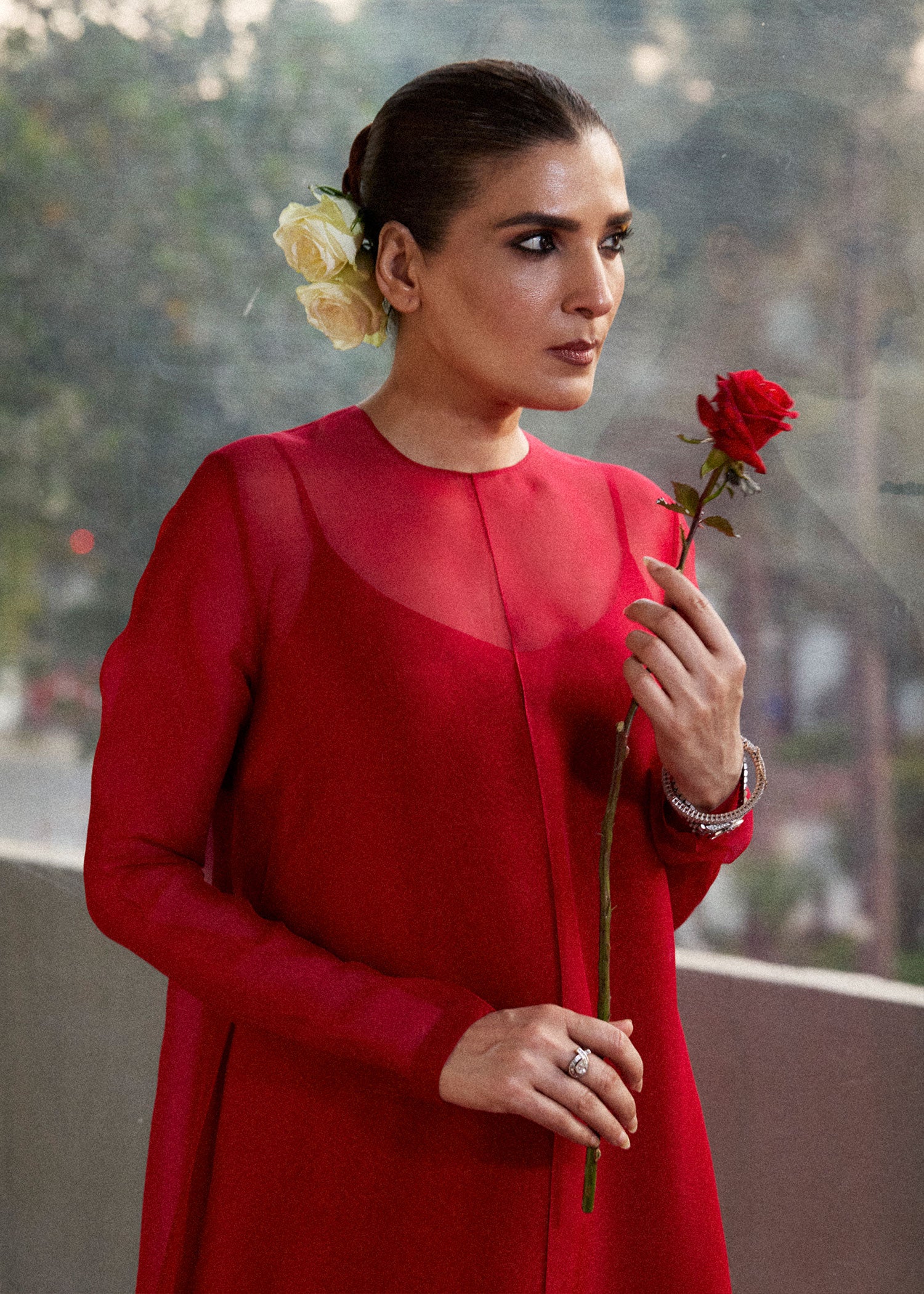 A luxurious A-line organza shirt, which includes weaving underneath. This outfit comes with a pair of wide-legged trousers and a raw silk slip underneath. This outfit is classified as a formal or semi-formal classic silhouette