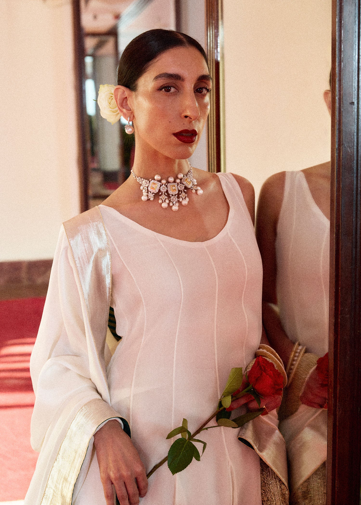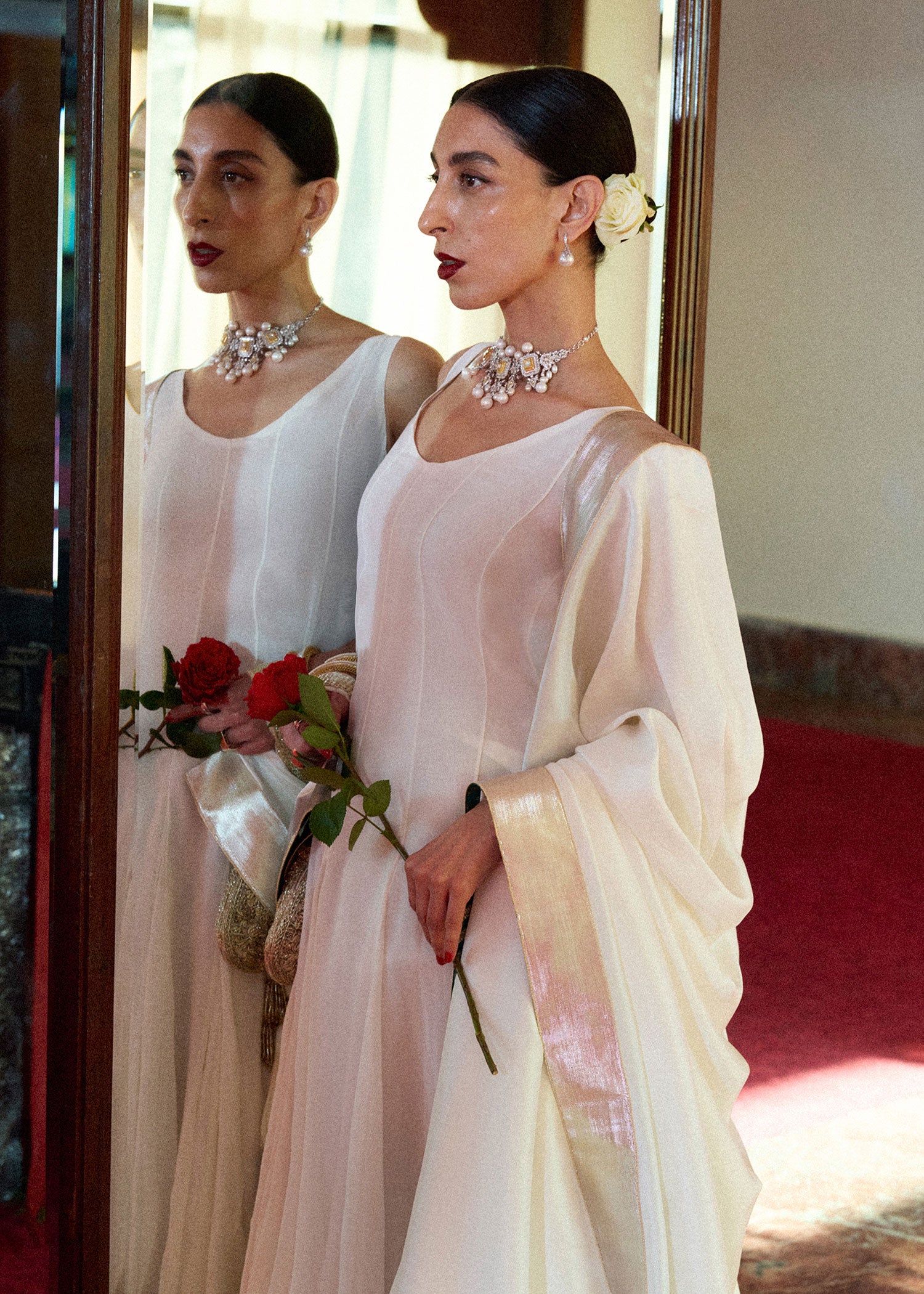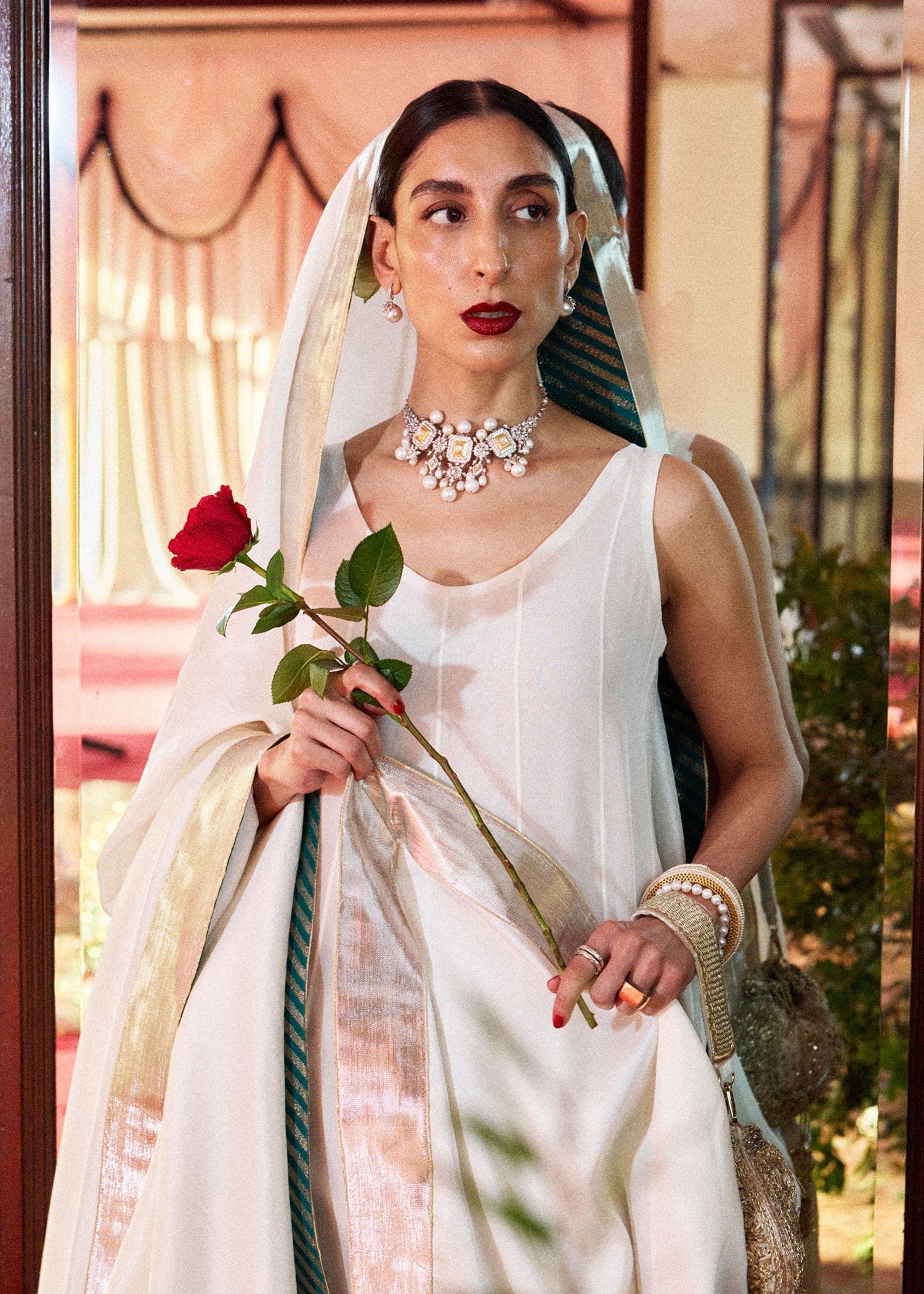 A sleeveless, scoop neck gown with fitted bodice. Its dupatta consists of a golden lappa on all four sides. It is made of a light, sheer chiffon fabric, giving it an ethereal quality.